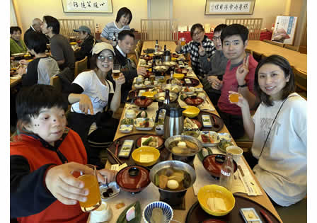 ICを降りてすぐそばのます釣り場で昼食を頂き、夜は山人(ヤモード)料理で、我々を迎えてくれました。温泉地の旅館の様な、刺身や揚げ物・茶碗蒸しのようなものは一切無く、手作りの心のこもった料理で一同感激しました。いのしし鍋なども出てきました。食事の後は例の如く男性陣の部屋で二次会を開き、盛り上がりました。